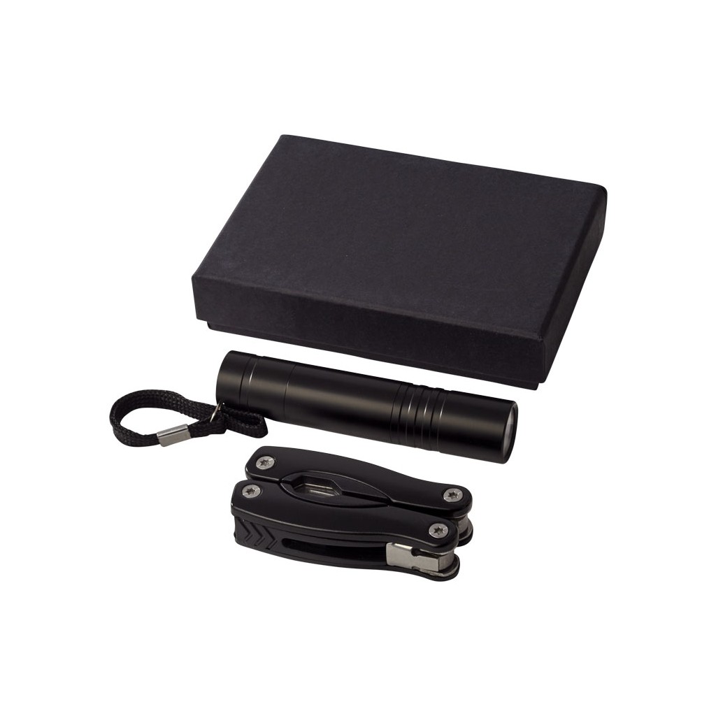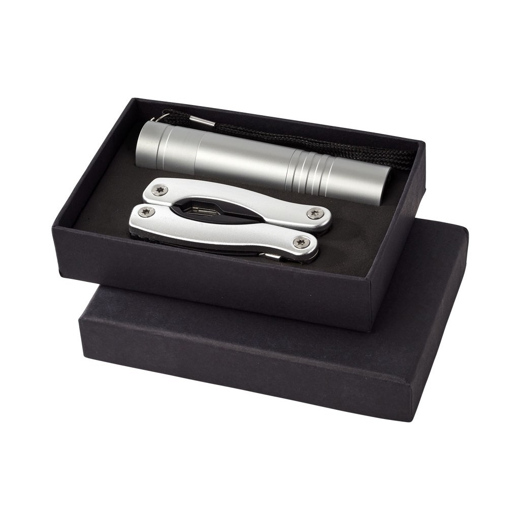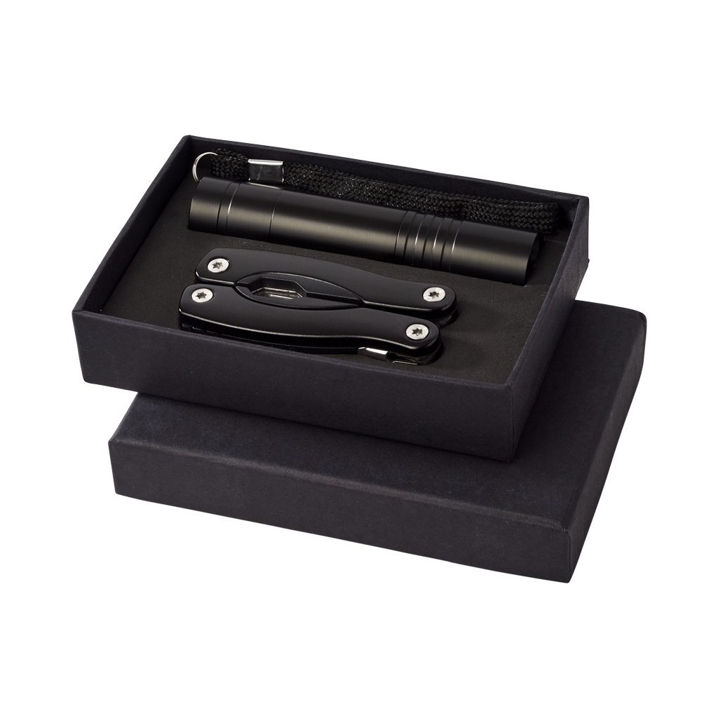 11 function mini multi tool with LED flashlight in black carton gift box with EVA inlay. Batteries included. Aluminum.