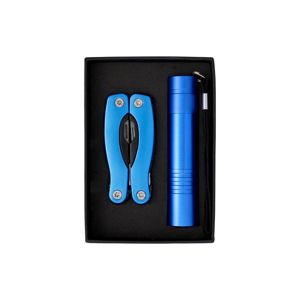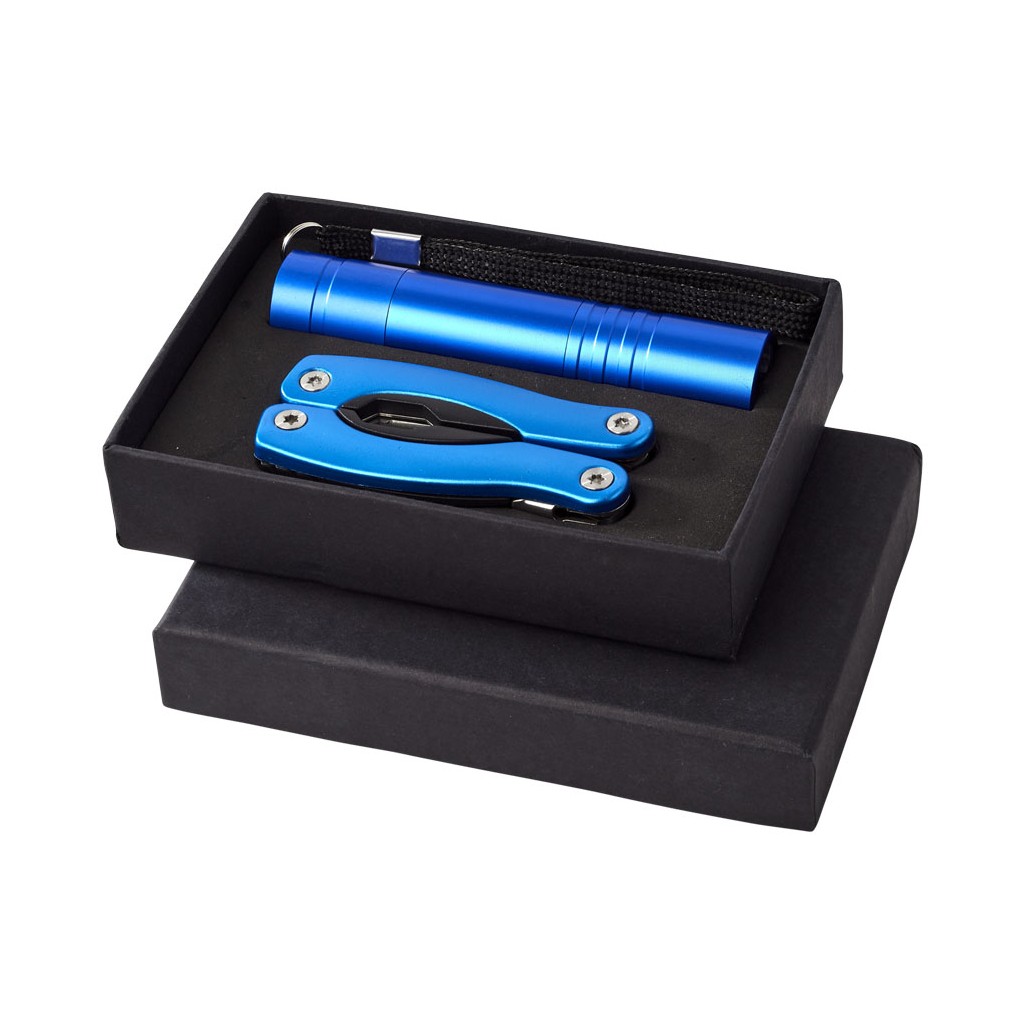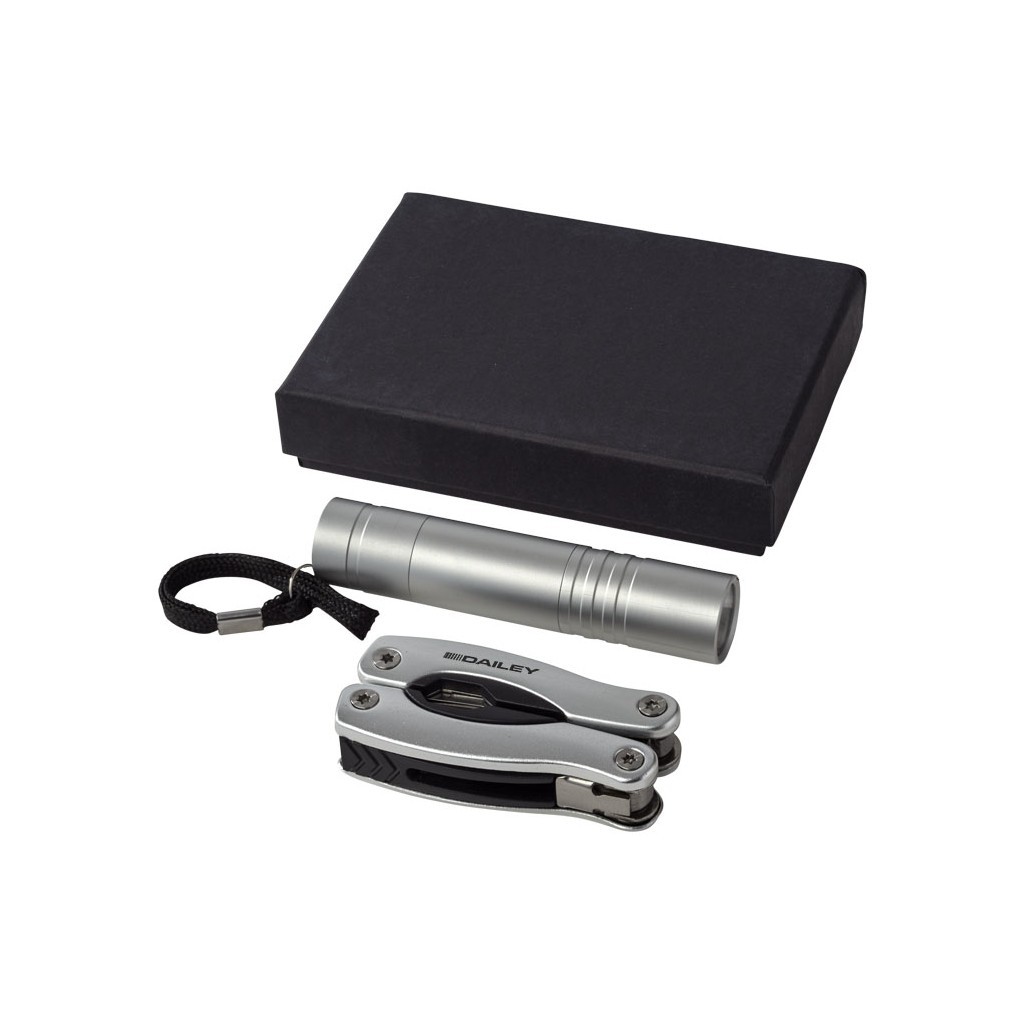 11 function mini multi tool with LED flashlight in black carton gift box with EVA inlay. Batteries included. Aluminum.