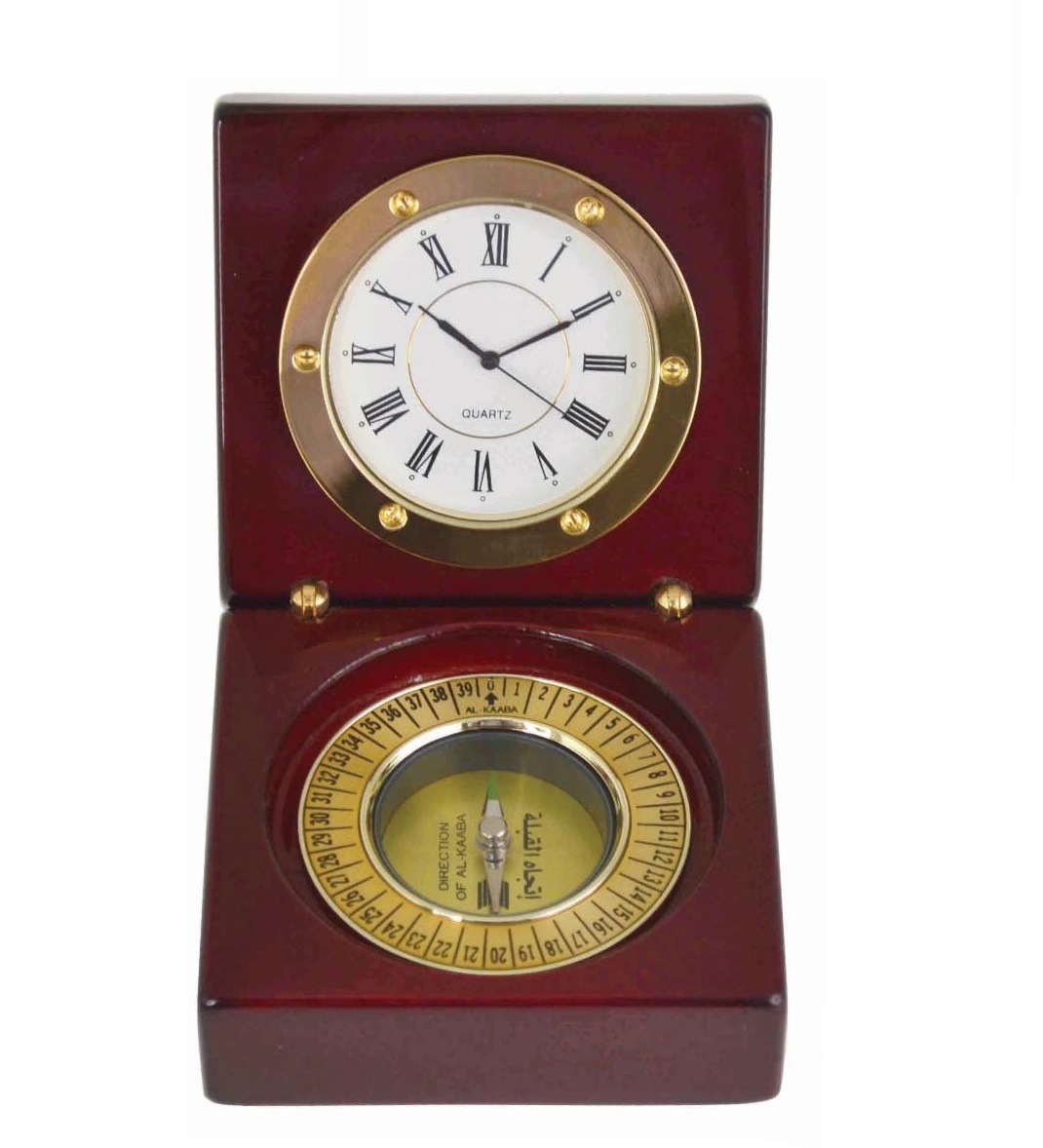 Elegant desktop clock with Islamic Qibla compass. The clock is with a face of Roman numberals, polished red wood finish and solid brass accents. This timeless clock compass will add charm to any office or home study.