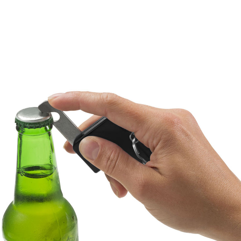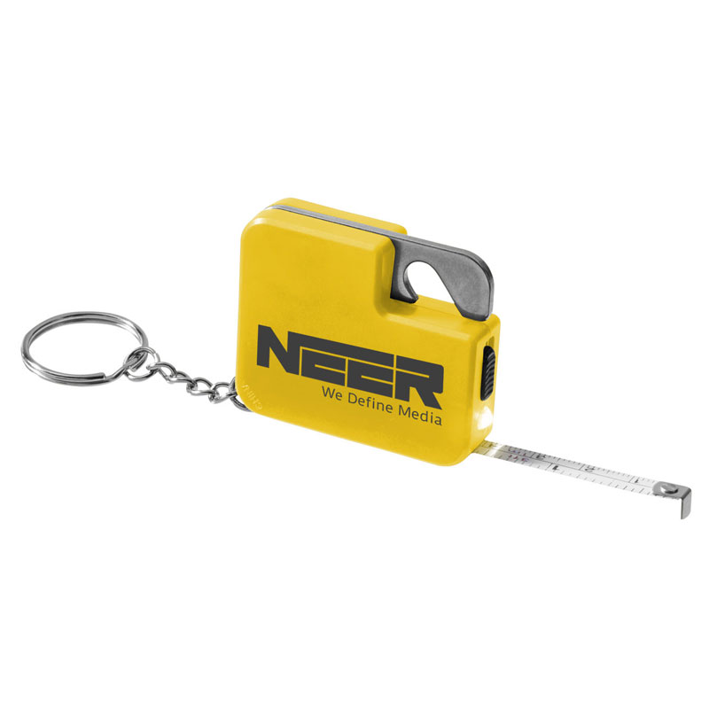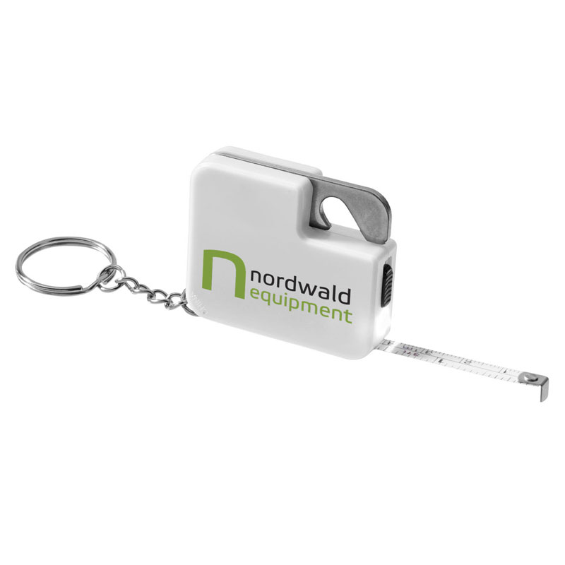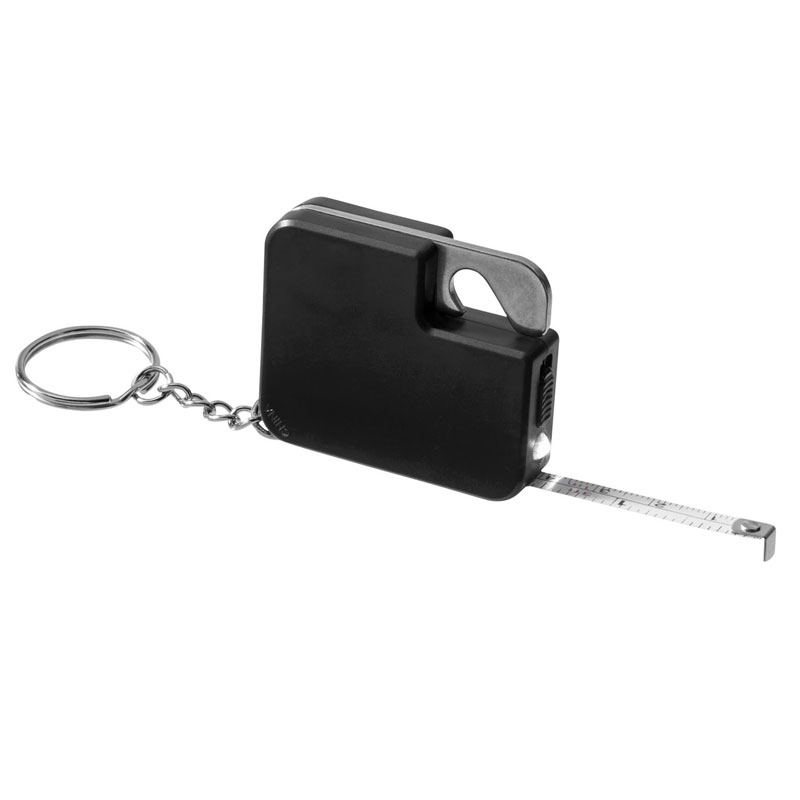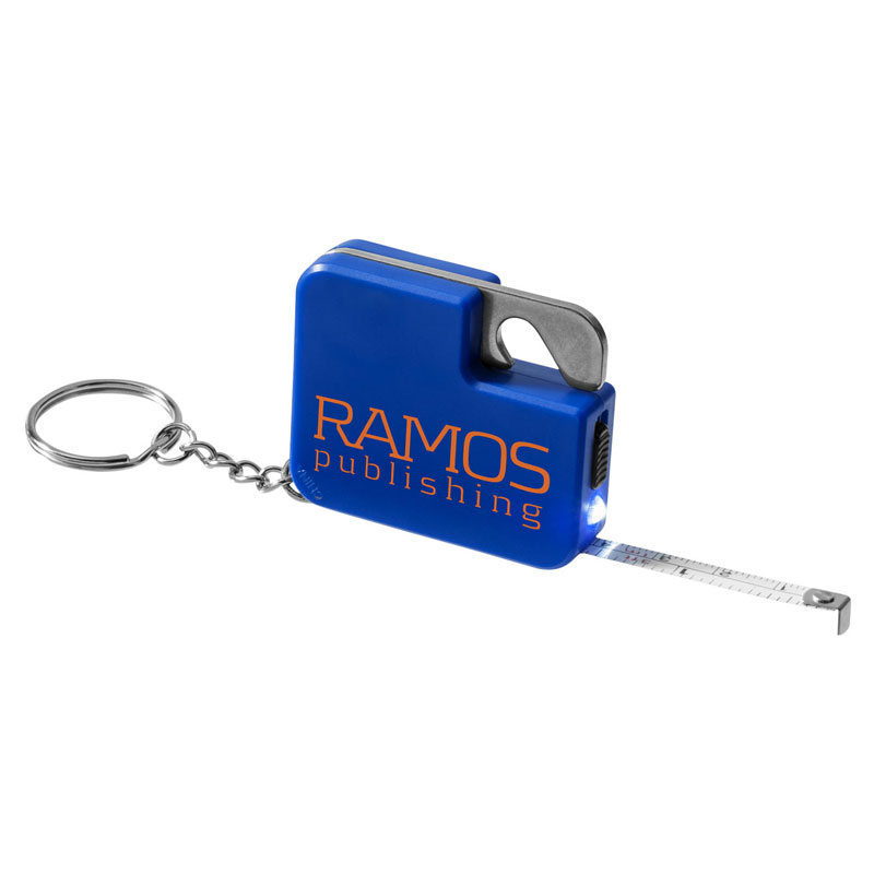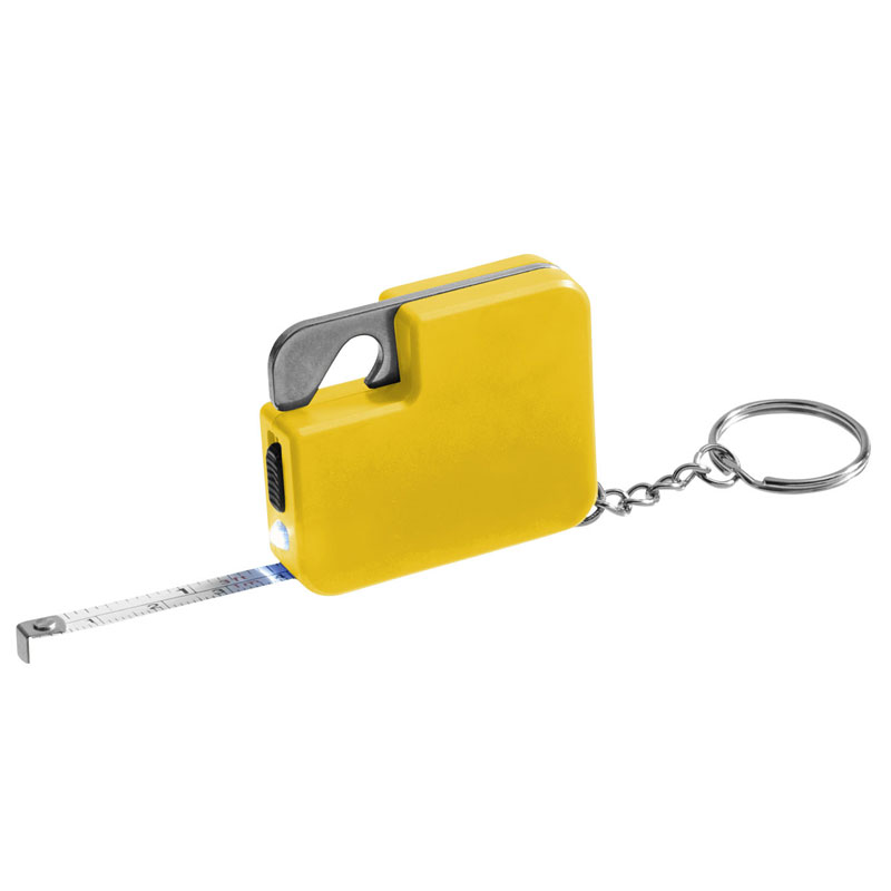4-in-1 multi tool key chain. 1 metre measuring tape showing centimetres and inches, bottle opener, single white LED lightand metal key ring