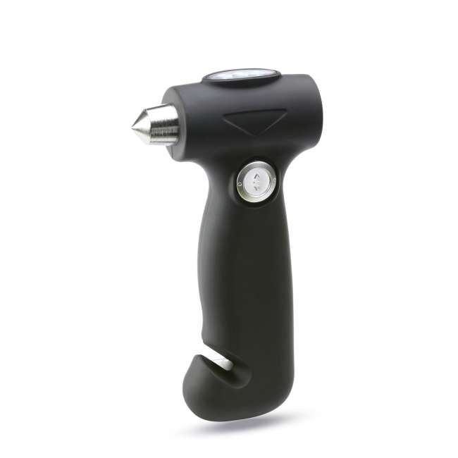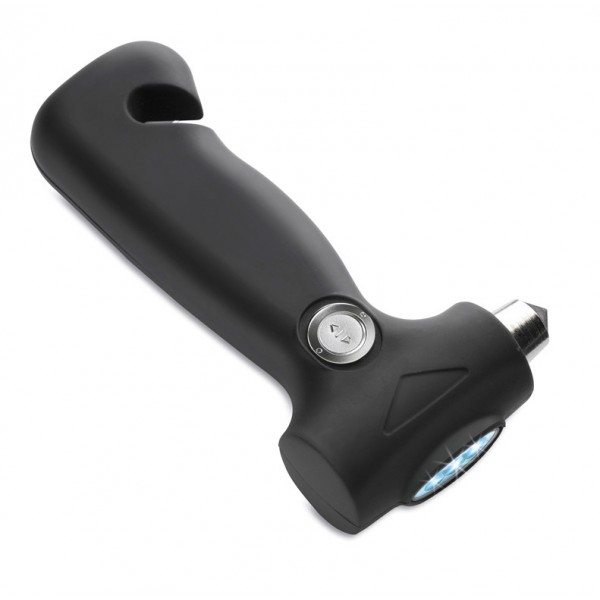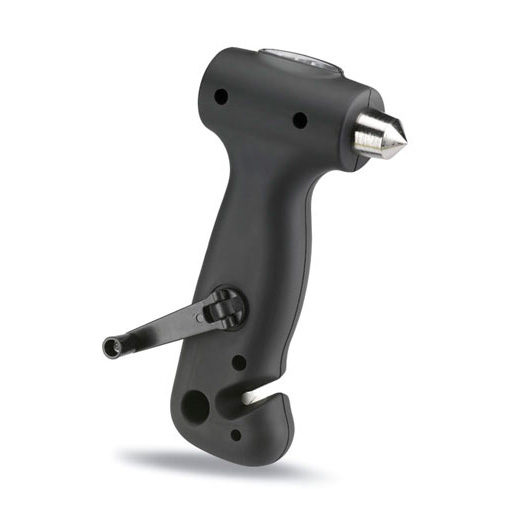 3 in 1 emergency hammer with 3 LED dynamo torch and belt cutter. ABS plastic in smooth rubber finish.