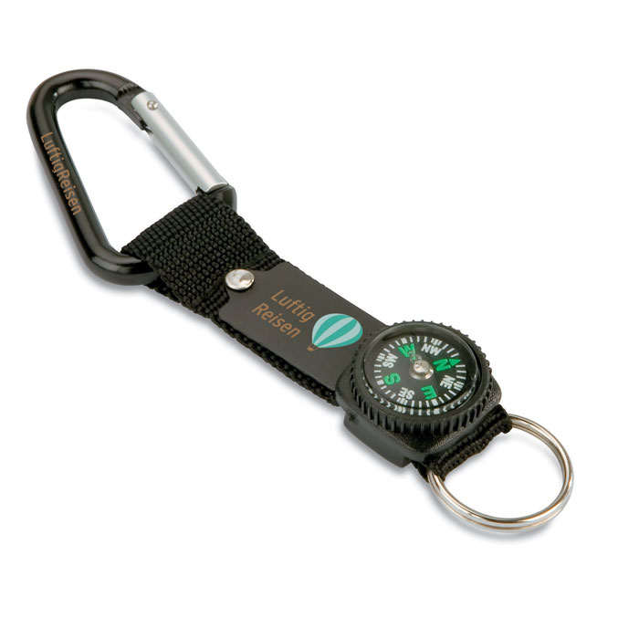 Carabiner keyring wih decorative compass and strong nylon strap with aluminum plate.