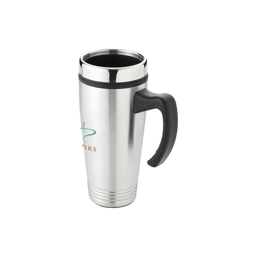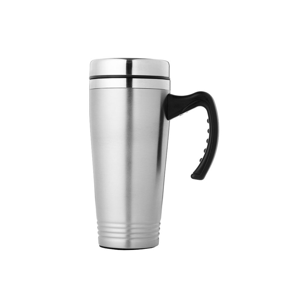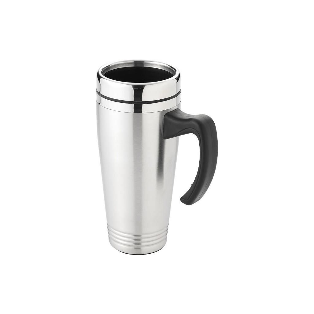 Double walled isolating mug with push on thumb-slide lid. Volume capacity is 500 ml. Stainless steel exterior, plastic interior.