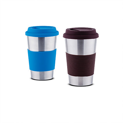 High quality double wall stainless steel mug with a silicone band/lid for ease of holding/drinking available in stainless steel with the bands in coffee and royal blue colors. Capacity 350 ml.